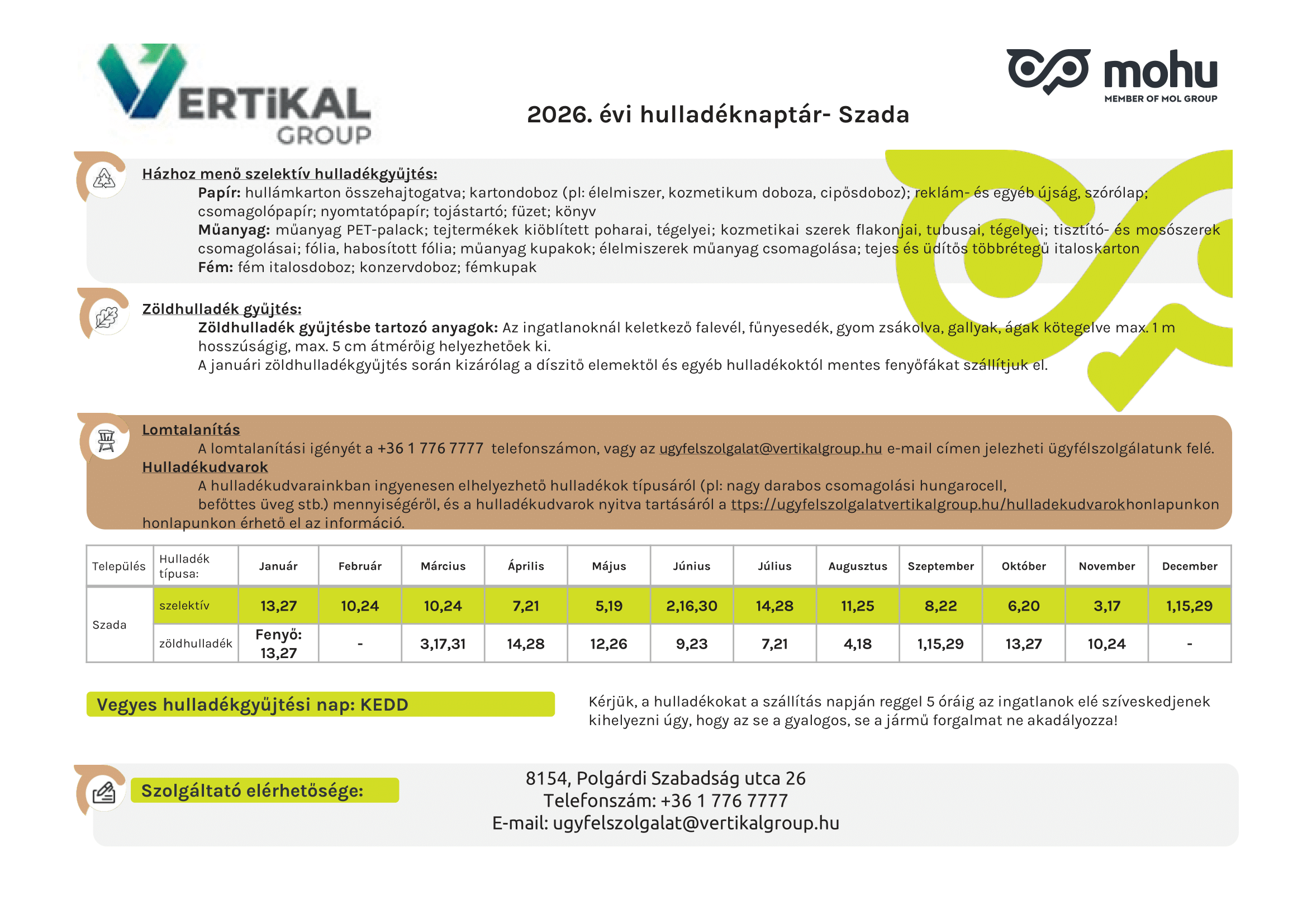 A Vertikál Group elkészítette a 2026. évi hulladékgyűjtési rendet Szada vonatkozásában.