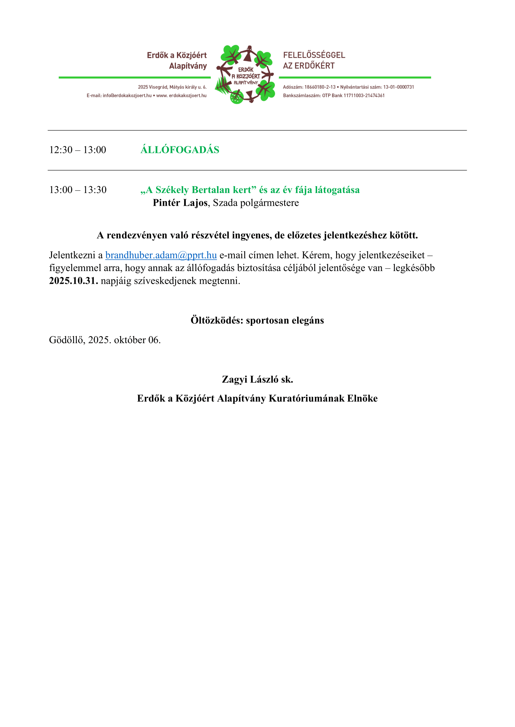 Az Erdők a Közjóért Alapítvány november 7-én pénteken Szadán tartja következő ülését. A konferencián kifejezetten szadai példákon keresztül mutatnak be a környezetünk védelmével kapcsolatos irányokat, kezdeményezéseket, közösségi programokat, amivel demonstrálható, hogy teremthető harmónia az ember és környezete között, az emberi tevékenység hogyan támogathatja a környezet védelmét, a természeti értékek megőrzése mellett hogyan segíthető elő az ember és a természet fenntartható együttélése.